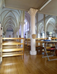 この写真は少しだけ開いていた扉の隙間から撮らせていただきました。 こうもり天井(リブ・ヴォールト天井)が美しいですね。楠原教会は、福江港から車で岐宿方向へ行き(約20分)、岐宿支所の信号を左折(二本楠方面)約10分です。