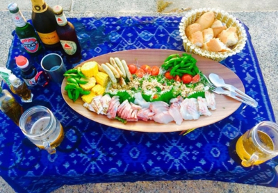 私たちも夕日が落ちる前に買い出しとテント設営を終わらせ、テーブルセッティング!魚は釣ってきた鯛やアコウやイサキ。あとはちょっとしたおツマミにお酒!