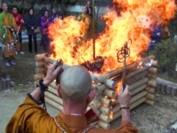 閉め切って真っ暗な本堂内では、僧侶達による読経にあわせ参拝客の願いが込められた護摩木がひとつひとつ燃やされていきます。立ち上る炎と煙で護摩壇の周りの僧侶達の顔が赤く火照り、お経を上げるのも苦しそうでした。