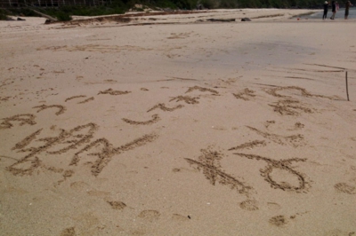 浜辺に立ってみると、なにか書いてました。娘が読みあげます。「ゆうこを、愛してますがなにか?」。。。だそうです。「どういうこと?」と娘が聞いてきます。「だれかが、ゆうこさんを愛してる。そして、そのことを、だれにも邪魔されたくない。ということを、世の中の人にアピールしたかったみたい」と説明してみました。・・・・まあ、とにかく、愛を叫びたくなるほど、いいビーチなのです。「せっかく香珠子のことを紹介するのなら、自分で紹介文を書いてみてよ」と娘に言ってみたのですが、書きたくない!書きたくない!とものすごい拒否反応です。イヤイヤ書かせてもおもしろくないし、、、と思い、「じゃあ、この海の良さをポーズで表現してみて!」と頼んでみました。