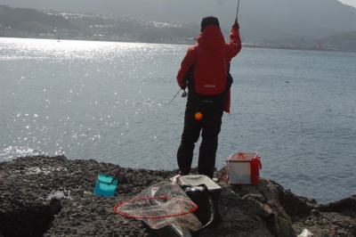 推定20代の若者。サングラスで顔がよくわかりませんでしたが、たぶんイケメン。「クロとか釣れるといいですけど」と爽やかに語ってくれました。最近、本格的に釣りにハマッたそうです。いい趣味じゃ~、がんばれ、若者! 静かに心の中でエールを送りながら、その場を後にしたのでした。