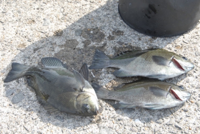 仲良く釣りをする4人に、突然割り込んできたオバさん(私)のプチ取材を快く引き受けてくれた。アラサーとみた。今日は9時頃に来て、クロ狙い。もうすでに3匹釣っていました。1人1匹を目指すなら、あと1匹ほしいところ?