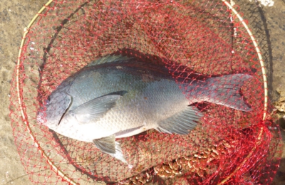 仕掛けを投入して、時折張り保つことを意識しながら流していくと、パラパラと出ていた道糸の出方が遅くなったので、スプールに指を当てて道糸の出を止めていると、穂先を押え込むと同時に道糸が弾かれるアタリがきた。先ほどよりも鋭い引きで、磯際まで寄せてきてからも幾度となく突っ込みをみせる。数度の突っ込みをロッドワークで交わし、取り込んだのは45cmの尾長グレだった。
