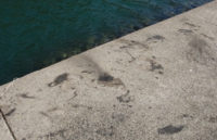 島に行くというのに、橋を渡った記憶がなかったため、近くにいた釣り人に聞いてみることに。案の定、牧島ではなく、戸石の「池下」というところらしい。ガ~ン、間違えた。やや落ち込んで、目線を下にすると、墨を吐いた跡発見! イカも釣れるみたい。いやしかし、タコかも知れん――ご存知の方はご一報ください。