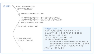 早速、購入してきたボイルとオキアミ生を海水に浸してから仕掛けの準備にとりかかる。浅ダナで当たっているとのことなので、ウキにガルツのグレ流技の0-(マイナス)を使用し、その下にガルツプレッシャークッション(GPC)のMサイズとした。道糸は、サンラインのマスラード3号で、ハリスにはVハード3号を2ヒロとり、ツケエが安定するようハリ上50cmのところにガン玉のG7を付け、ウキ止めは誘導幅をとらず2ヒロのところ結んだ。