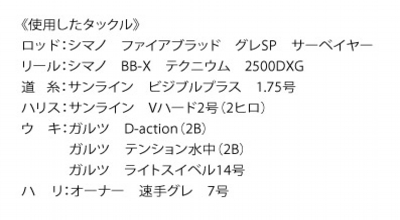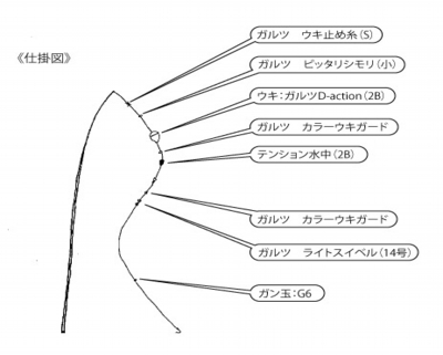 仕掛けは、道糸にサンラインのビジブルプラスの1.75号とし、ウキにガルツのD-actionの2B、その下にテンション水中の2Bとし、半誘導仕掛けで狙うことにした。ハリスはVハードの2号を使用し、道糸とハリスはガルツのライトスイベルで結束した。タナは竿1本とした。