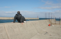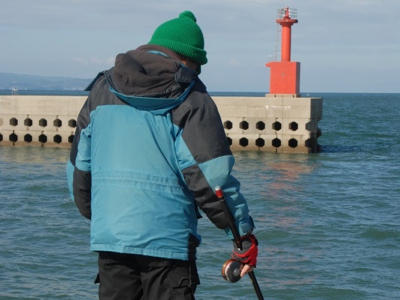赤い灯台(かな?)に釣り人。オジさんも底もの狙いだそうで、釣り竿を下にかまえてました。景色は最高ですが、ホント風が強い。冬の釣りは、防寒対策バッチリでないといかん。強風が吹き荒れる中「オジさんたち、がんばって!」と心の中で声援を送り続けたのでした。