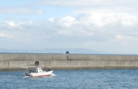 小型船舶と釣り人と。日曜日の昼前でしたが、船がわりと頻繁に行き交っていました。何を獲っているのかしら??