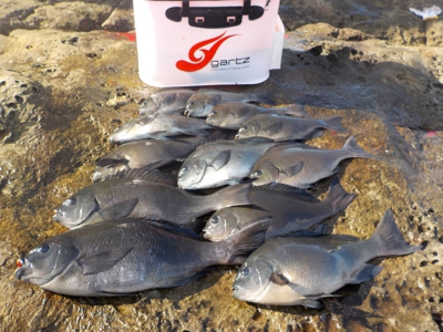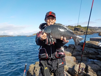 ウキ下を竿1本半ピロにして仕掛けを投入すると、37cmの尾長グレを仕留めることができた。続けると35cmの口太グレが当たってきたので、タナを竿1本半に変更する。仕掛けを投入して流していくと、ウキを少し押えこんでから一旦停止し、スーッと海中へと消え去っていった。ゆっくりと引きを楽しんで取り込んだのは、41cmの口太グレだった。その後は、37cmの口太グレを仕留めたところで、14時半となったので納竿した。