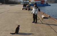 本日、最少年の釣りボーイと地元ネコとのふれあい。ゆっくりとした時間が流れとるなぁ。