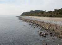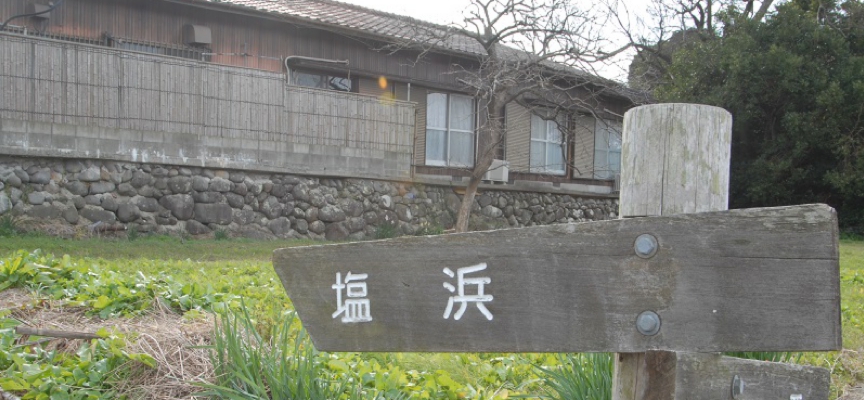 唐比温泉口の県営バスから海側へ車を走らせること数秒で、この「塩浜」の案内看板にたどり着きました。地名からして浜はこっちだ、きっと!