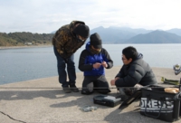 柄の長いひしゃくのような道具を使い、まきえしてクロをおびきよせ……。