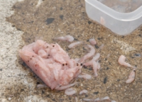 このエサを釣り針に刺して釣るシンプルなスタイル。「あまり撒き餌は好きじゃない。釣れるだろうけど、海が汚れてしまうから」。オヤッサンはナチュラリストでもありますな。