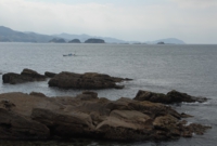 岩がゴツゴツしたところで、さきほどの若者は釣っておりました。釣り姿が美しかった。あ、行き交う船も身近に見えるんだ。風光明媚な釣り場です。