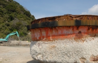岸壁まで行くには、工事中のところを迂回します。歩行者用の通路が確保されているので、ちゃんと岸壁までたどり着けますよ。それにしても、写真の巨大コンクリートの塊が、個人的にすごく気になりました。コレ、何だろ。見た目が大きな釜に見えて、豚汁作ると何人前できるのだろうと、釣りとはまったく関係のない妄想をしてしまいました。大釜に見えませんか?