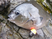 仕掛けの投入を繰り返すと、ウキを少しだけ抑える当たりがあったので、合わせを入れると足元へと一気に突っ込んでくるので竿の弾力でためて少しずつ浮かせにかかるが、鋭く突っ込んでくるので、それをロッドワークで交わし、取り込むことができたのは、40cm、1.2kgの丸々としたオナガだった。