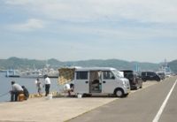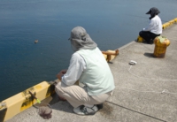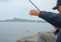 さっそくオジさんにプチインタビュー。オジさんのポリシーは「エサ代を安くしていかに釣るか」だそう。私がカメラを向けると、運悪く小さいアジが引っ掛かってしまい「あら、これは小さかったね」と苦笑い。なんだか、すみません……。「瀬渡し船もあるけど、船代が高いからね。いっそのこと、がんばランド(近くにある直売所)で買った方が、新鮮で安いよ」と冗談も上手いオジさんでした。