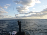 潮に向かって遠投し、それに合わせてマキエも遠投して、潮に合わせて仕掛けを送り込んでいくと、いきなり道糸が弾かれる当たりがきて、40cmオーバーのイサキを釣り上げることができた。続けて40cmほどの尾長グレを釣り上げたところで満潮の潮止まりとなってしまった。