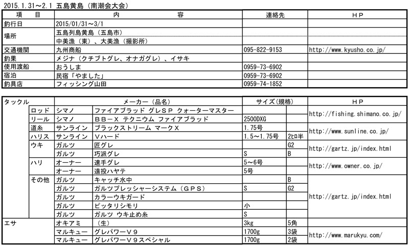 2015年1月31日(土)から2月1日(日)に所属するクラブの冬季大会で五島列島福江島沖の黄島に釣行した。