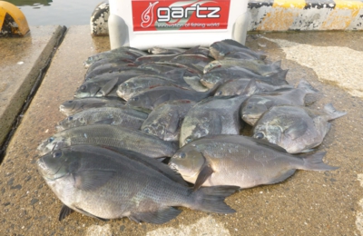 本流の重みも喰わって重量感たっぷりの引きを楽しませてもらいタモ入れしたのは、43cmの口太グレだった。続けて40cmの口太グレが当たってきが、狙いの尾長グレではないので、直結部のガン玉をG5からG6に変更して少し浅いタナを意識して狙うことにした。