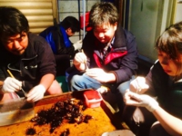 ウニ漁を終えてからがもうひと作業。ウニかきが待っています。今回は取材で来ていたテレビ局の方も半ば強制的!?にお手伝いしてくださいました。家族4人分のウニかきが終了したのは夜の22時すぎ。この作業なくして美味しいウニは食べれないのです。