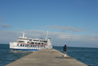 「さっきまでもっと釣り人がいたんだけどね」と手前のオジさんが教えてくれました。この日は、天気は良いけど、風が強い。なかなか釣れないと、みなさん早めに退散したようです。あ、フェリーが熊本から来た。