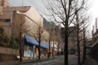 下ると、最初の大園小学校が面している大通りに出たので、太神宮バス停方面へ戻ることにしました。すると、滑石らしい光景が。滑石といえば団地。山の手までアパートが続きます。手前のバスケットボールのゴールが小さく見えますね。大園公園は、迫り来る!?団地を見ながらスポーツが楽しめます。