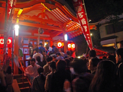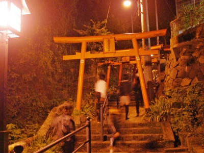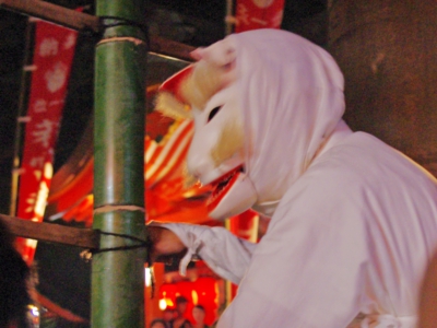 さて、毎年10月14日・15日の2日間に渡って行われる「竹ン芸」の見どころと言えば、狐に扮した男性陣が高さ約10メートルの2本の竹の上で繰り広げるアクロバティックな演技でしょう。初日は1日に2回、2日目は3回それぞれに見ることができ、今年私は2日目の夜8時からスタートの回へ出かけました。2日間のシメとあって境内には溢れんばかりの人・人・人! 人波をかきわけて竹のすぐそばまで潜りこみシャッターチャンスを待ちます。私以外にもカメラを持った見物客が大勢いましたが、見る側の最大のルールがフラッシュをたかないということ。何メートルもある竹の上で、しかも狐の面を着けて演技するわけですから、限られた視界がさらに見えにくくなるのは危険という訳です。