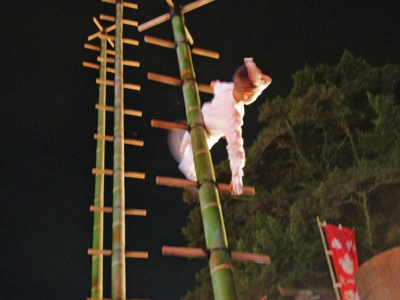 フラッシュを切って見る側も準備万端。狐のお出ましを待ち構えているとトップバッターの子狐さんが登場してきました。なんと幼稚園に通っているかわいい子狐さん。演技するのは子狐用の小竹ですが、それでもその高さは約5メートル。大人の私でも怖いだろうなぁと感じる高さでしたが立派に演技してくれました。