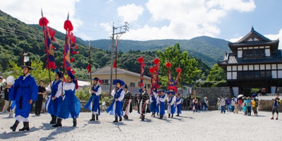 対馬藩主の居城、金石城跡の櫓門(やぐらもん)を出発した一行は、厳原港までの1.6kmの道のりを歩きましたが、この日の気温は30度を超える猛暑日。行列に参加した皆さんは大変だったことでしょう。