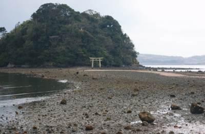 干潮のときは、鳥居をくぐって、島の反対側から神社に登ることができます。