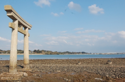本物の鳥居は、なんと内海湾の海の中にあります。いつもは海の中にあるので、この「小島神社」には渡れません。月に2回の大潮のときにだけ、この鳥居がはっきりと現われます。太陽と月の引力によって起こる海の潮の干満。その干潮のときに海が割れて神秘の参道が現れます。
